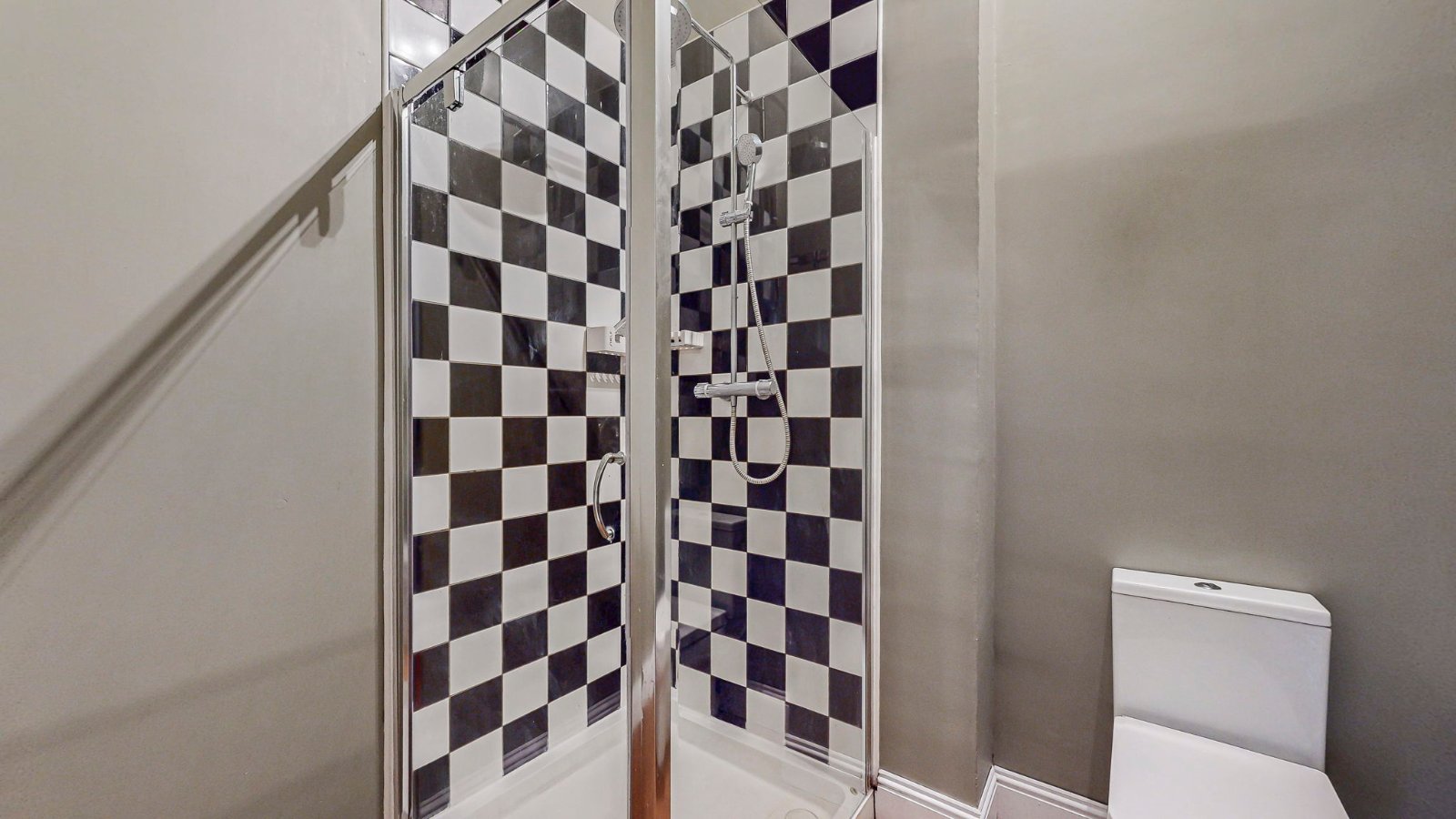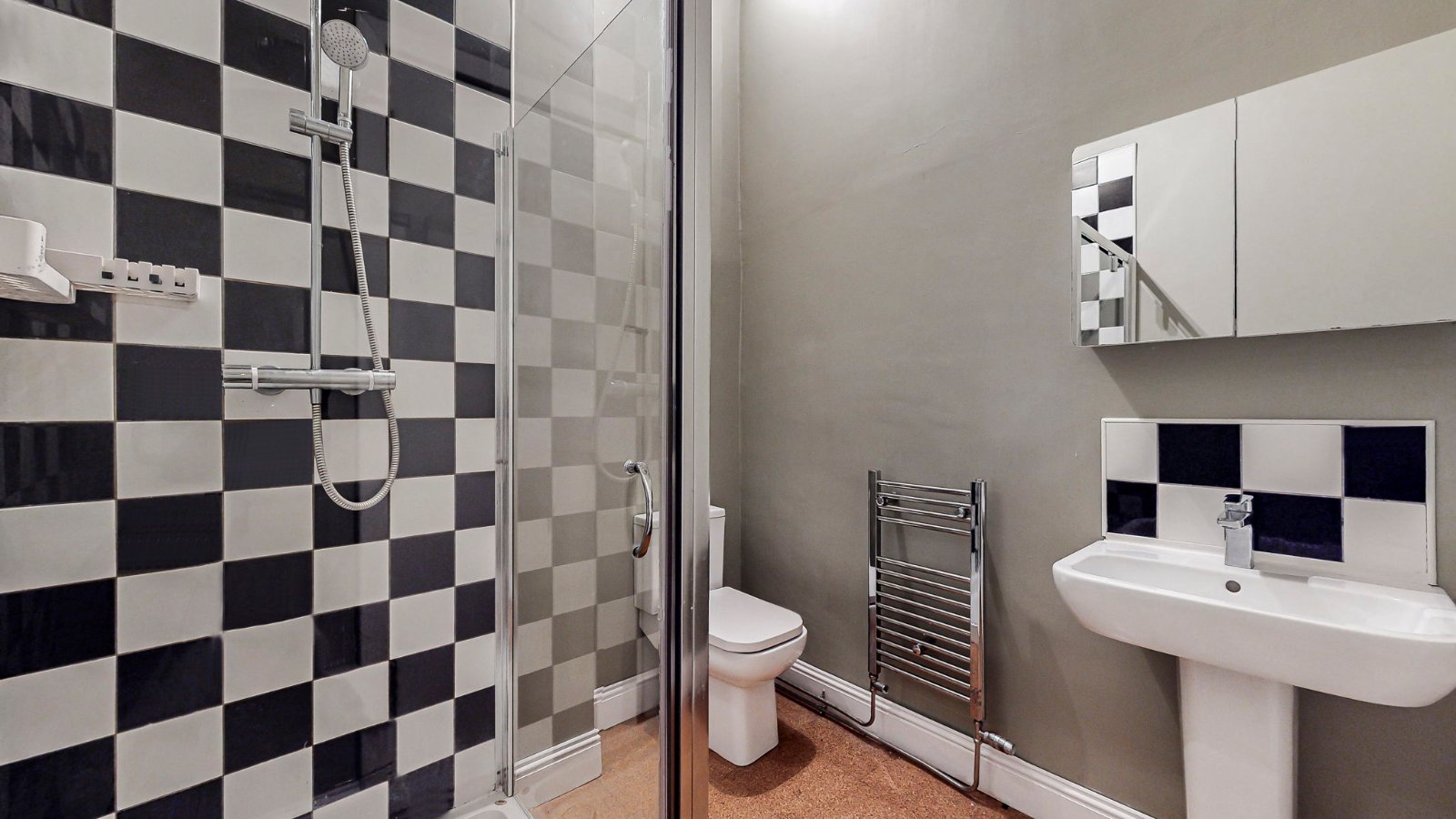 Accessed via secure entry into a communal stairwell, the property opens into a welcoming reception hallway. The spacious bay-windowed lounge features a decorative fireplace, built-in shelving, and a large storage cupboard, while the adjacent double bedroom is well-sized with excellent natural light. To the rear, a large dining kitchen offers a fantastic space for cooking and socialising, fully fitted with an induction hob, electric oven, integrated microwave, fridge/freezer, and washing machine, with ample space for a dining table and chairs. A modern shower room is finished in stylish monochrome tiling with white sanitary ware and a walk-in shower.