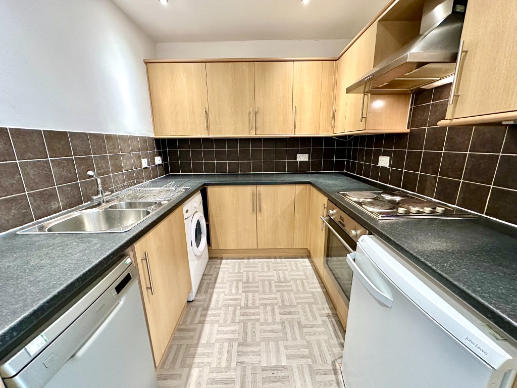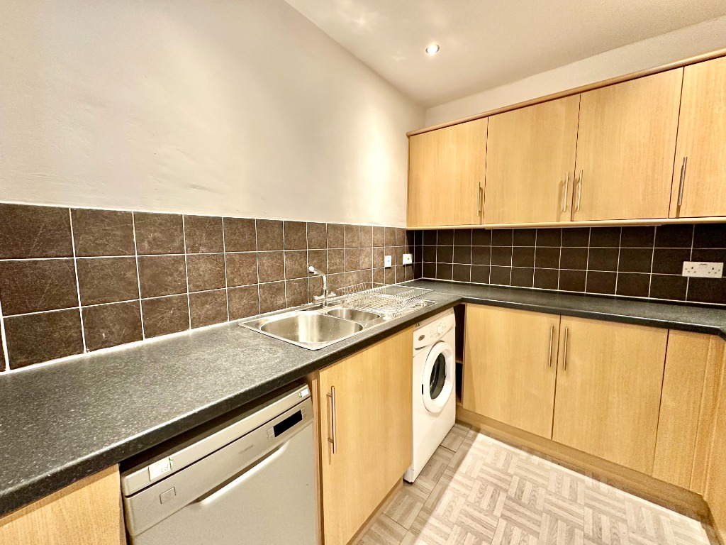 The bright and roomy lounge has feature bay windows offering street views, decorative alcove storage area and a feature fireplace. The internal fitted kitchen hosts a range of floor and wall mounted fitted units, and a selection of appliances including a fridge (with freezer compartment), four-ring electric hob, oven, dishwasher and washing machine.