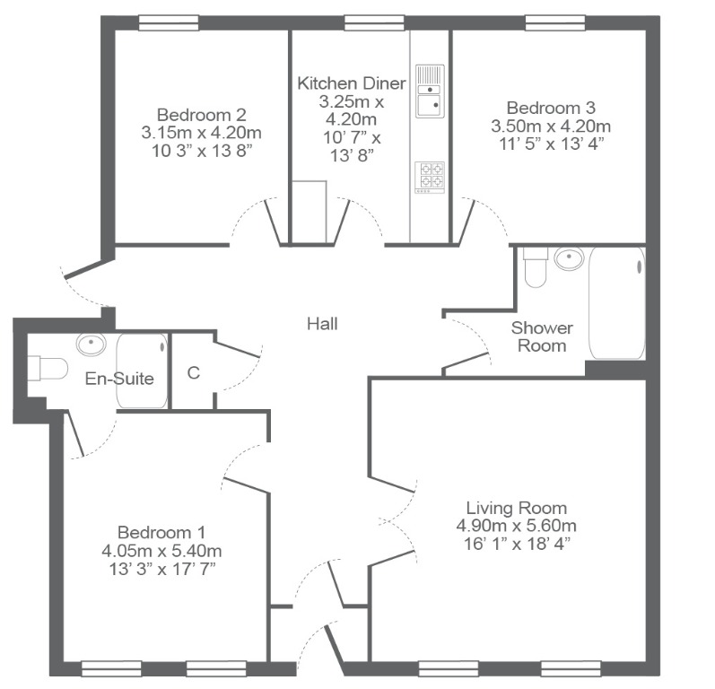 This basement level main door flat comprises of spacious hallway with storage, three good sized double bedrooms, one with en-suite shower room, separate internal shower room with double sized walk-in shower cubicle, bright modern dining / kitchen with all essential appliances and large living room.