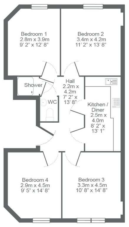 The flat is located on the third floor on a traditional building and can only be access via stairs and due to it's upper level position it has open views to both sides. Internally there is a spacious hallways which opens out to all apartments. There are four good sized double bedrooms, an internal shower room with shower cabinet and electric shower, an internal WC and large dining kitchen which comes complete with appliances including washing machine, fridge freezer, ceramic hob, electric oven and microwave.
