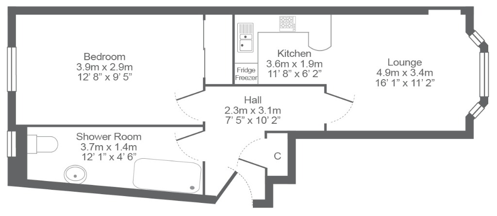 The hallway has a storage cupboard off and opens out to a front-facing bright open plan lounge/kitchen which comes complete with appliances including washing machine, fridge freezer, gas hob and electric oven. Facing out to the back of the building is a bright, modern shower room, and a double bedroom with a large window letting in lots of natural light.