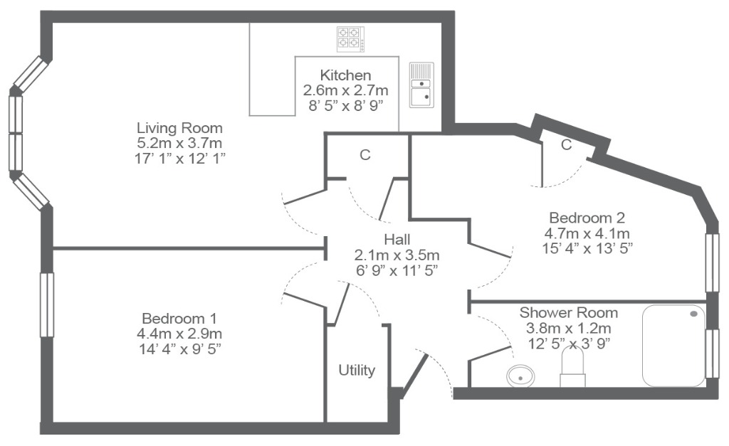 This beautifully presented property comprises of entrance hallway with storage cupboard and utility cupboard off which houses the washing machine and tumble dryer, spacious, bright open plan living room / kitchen with feature bay window and modern fitted kitchen units with brand new appliances including full sized fridge freezer, ceramic hob, electric oven and microwave. There are two good sized double bedrooms and finally the shower room with modern ceramics and mains powered shower inside a walk-in cubicle.