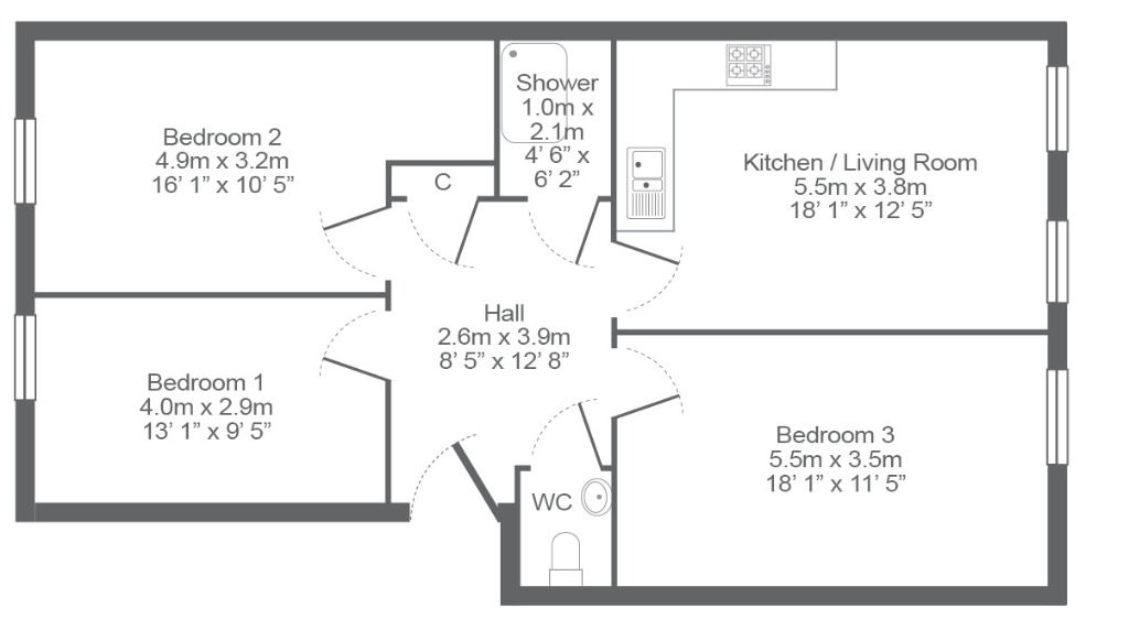 Situated on the top floor and accessed only via stairs, the property comprises welcoming hallway with storage cupboard, three good sized double bedrooms, all fully furnished, internal shower room complete with electric shower and a separate WC complete with wash hand basin. Completing the accommodation is the spacious open plan modern kitchen / living room which comes complete with essential appliances.