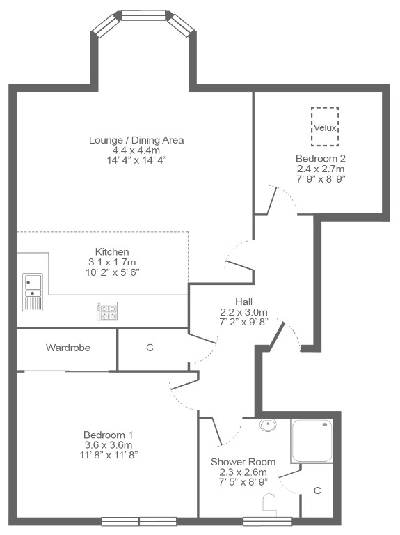 Internally the accommodation comprises of reception hall with storage cupboard off, bright open plan lounge / kitchen with feature bay window and appliances including fridge freezer, washing machine, gas hob and electric oven, two bedrooms , the master being a good sized double and the second bedroom is a single in size or could be used as an office/study. Finally the shower room which features white ceramics and a shower cubicle.