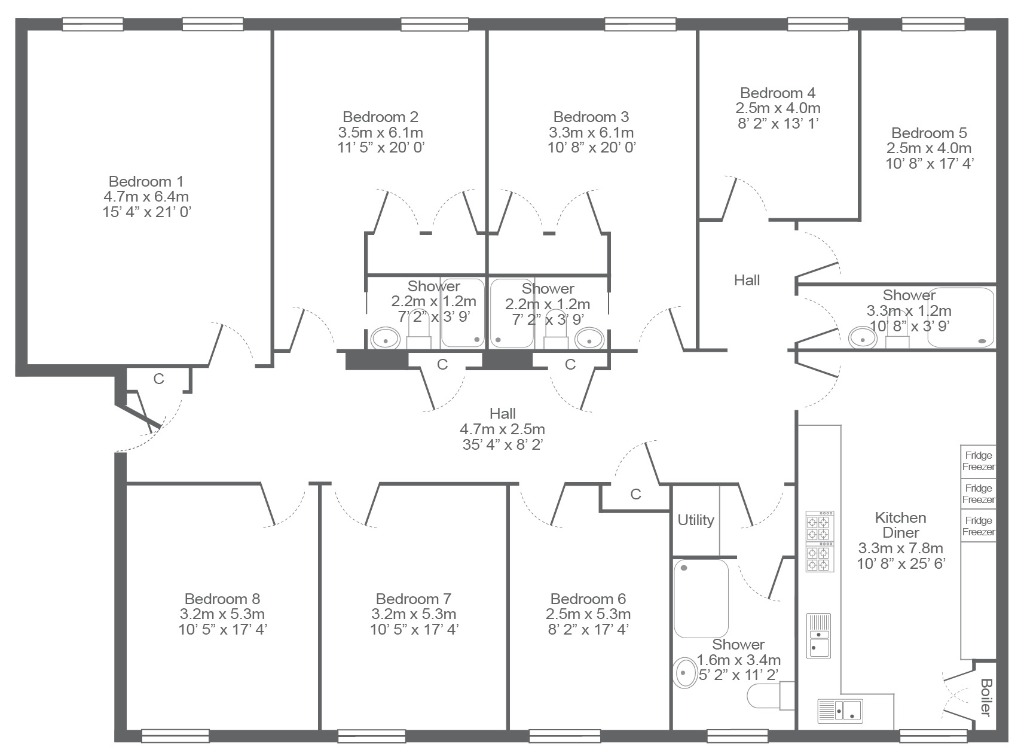 The accommodation is located on the preferred first floor and comprises of very large entrance hallway with four storage cupboards off, eight generously sized fully furnished double bedrooms two of which have en-suite shower rooms, spacious kitchen with dining area which is fully fitted and comes complete with appliances including three fridge freezers, microwave, seven burner gas hob with double electric oven and grill and dishwasher. There is a seperate utility room which houses the washing machine and tumble drier, and finally there are 2 modern shower rooms with white ceramics and walk in shower cubicles.