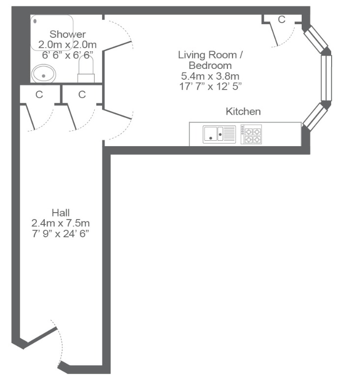 The accommodation is entered via shared communal hallway and the apartment can only be accessed with keys. The open plan kitchen / living / bedroom area comes complete with recliner chair and table, double bed with mattress, bedside table, chest of drawers and wardrobes. The kitchen area is fitted with brand new microwave oven/grill and hob, under counter fridge as well as a washer/dryer.