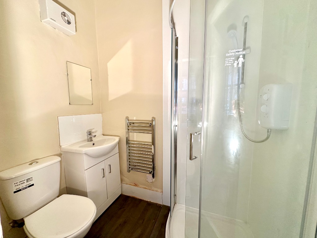 The modern private shower room has a WC, sink and shower cubicle with an electric shower.