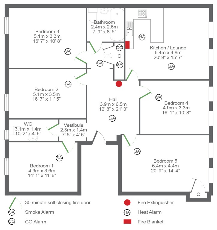 The accommodation comprises five good-sized double bedrooms, one with an en-suite shower room, a spacious fitted kitchen-lounge area offering ample storage and workspace, and a bathroom with an electric shower.