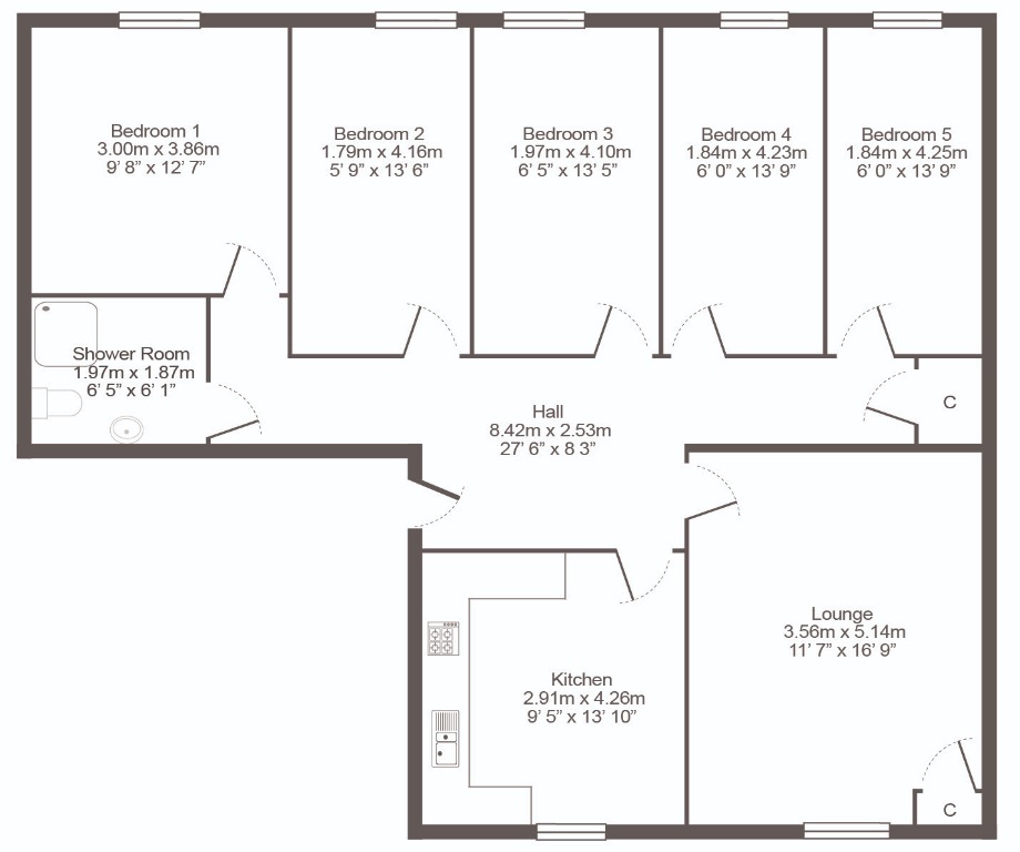 A well-presented first floor flat offering bright and spacious accommodation which comprises of large entrance hallway leading to five double bedrooms, spacious living room, generously sized and recently refurbished kitchen, along with shower room/WC. The property further benefits from gas central heating and HMO licence.