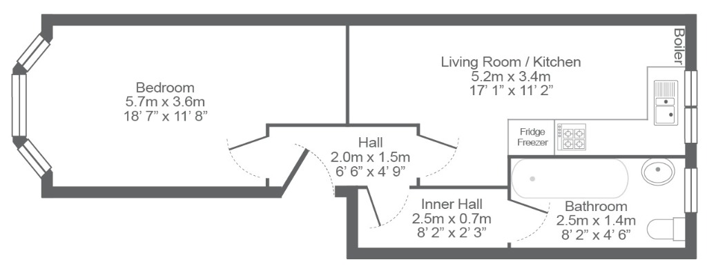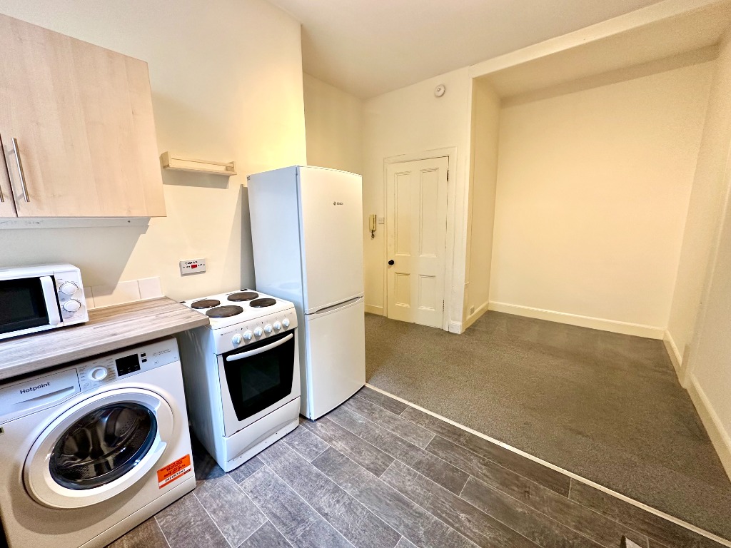 Internally there is a small hallway which opens out to all rooms. The open plan living room /kitchen has a range of wall and floor units and comes complete with appliances including fridge freezer, washing machine and electric cooker. The spacious bedroom has a feature bay window and handy recess area and finally the bathroom which has a white three piece bathroom suite and electric shower over the bath.